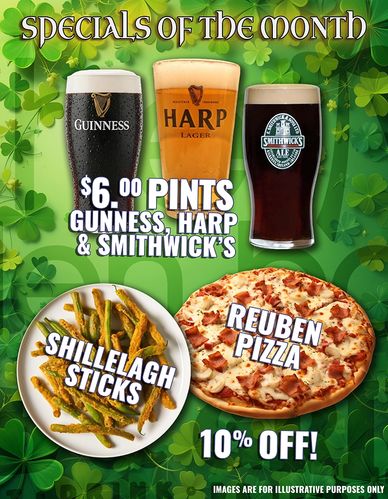 St. Patrick's Week is nearly upon us at Flaherty's Arden Bowl—join the fun from March 11th to 17th! Feast on corned beef & cabbage, Irish stew, Reuben sandwiches, and our famous Reuben pizza, with featured Irish drinks flowin' all week.